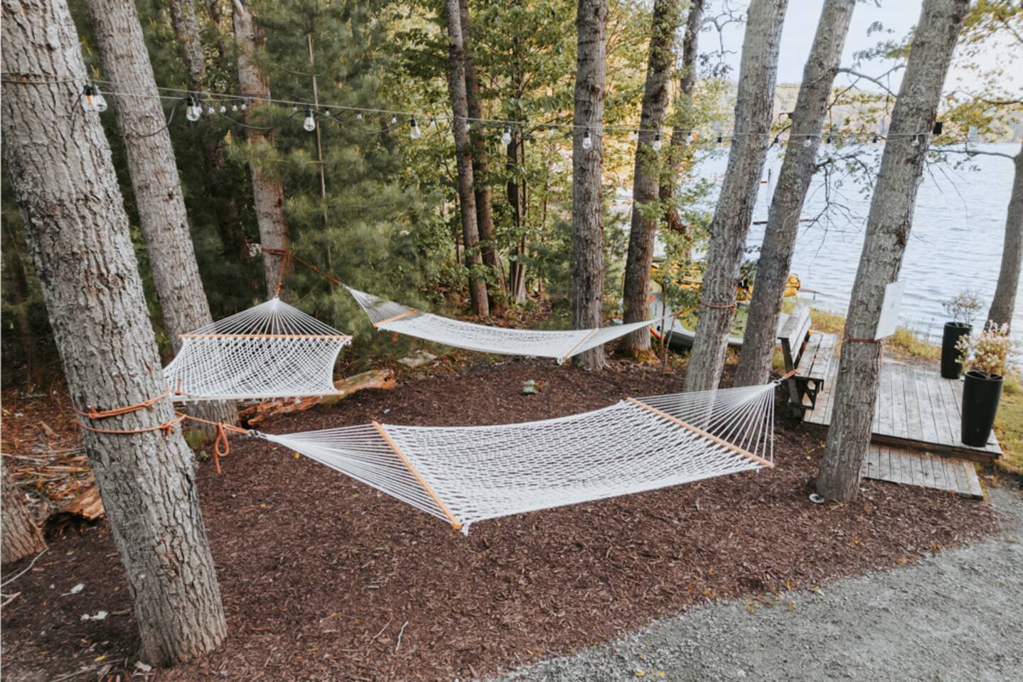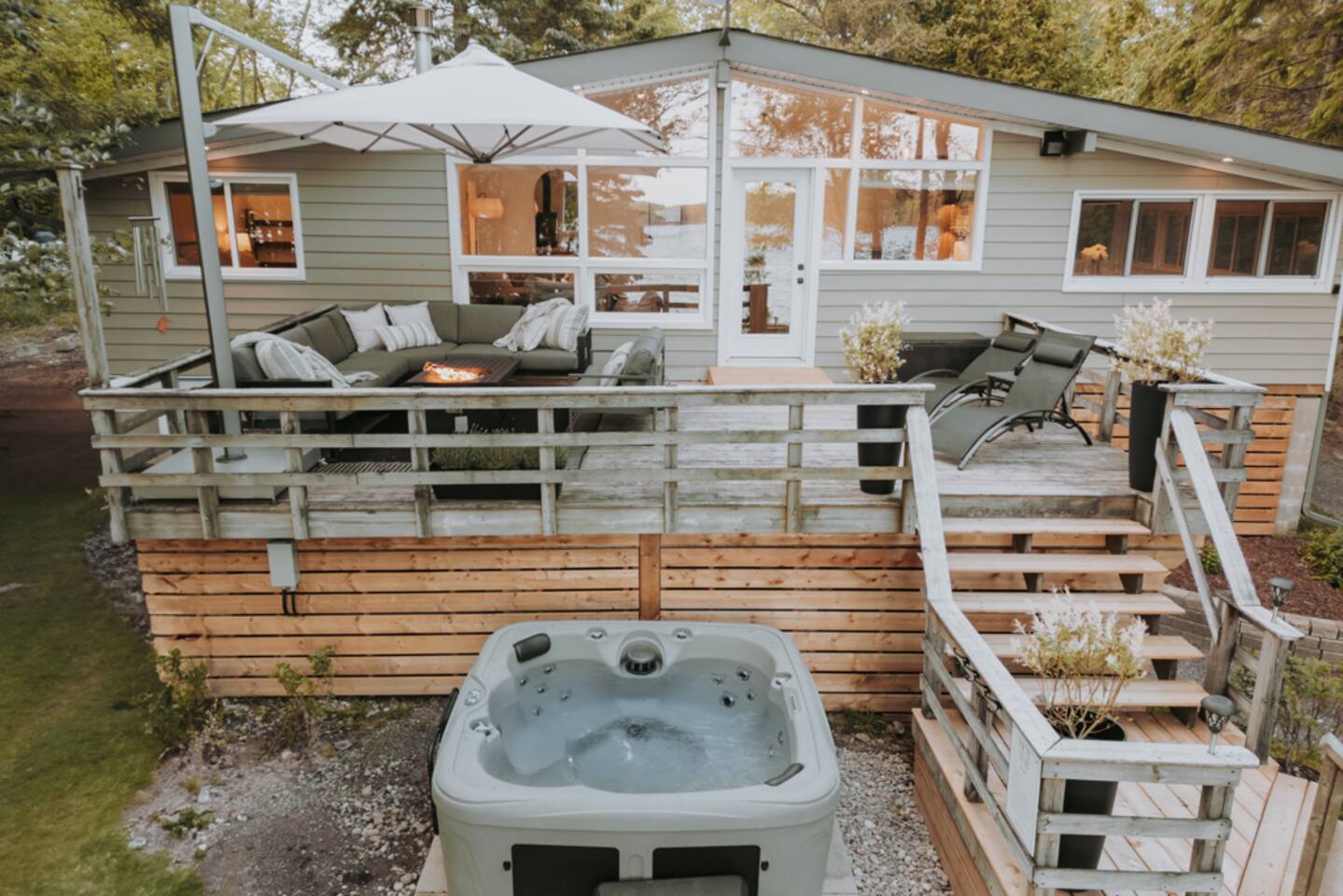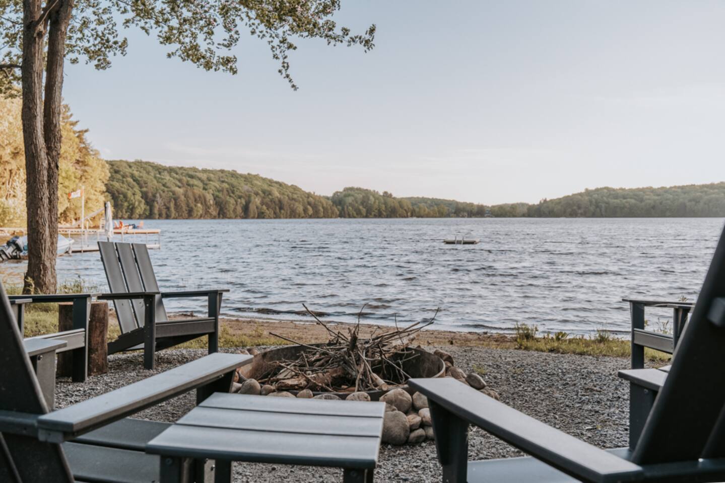Key Features & Amenities -------------------------------- - On quiet 3 Mile Lake w/ West-facing sunset views - Hot tub - Private sandy beach - *NEW* Dock (not in photos) - Air conditioning - 2 Kayaks, 2 SUPs w/ life jackets (for adults and -children) - Lakeside Fire Pit - Hammocks overlooking lake - *NEW* Electric Vehicle Charger - Netflix - Back-up generator (Muskoka gets power outages - but you won’t!) - 180 Mbps Starlink internet (great for streaming & working) - Board games (Settlers of Catan, Code Names, Cranium & more!) - Fireplace & cozy couches - Dedicated office w/ desk & *NEW* extra monitor + HDMI/USB-C cable - Chef’s kitchen - BBQ - Big deck facing the lake - *NEW* Bassinet/Crib - Centrally located in Muskoka; 20 min drive from Port Carling, Huntsville and Bracebridge Lakeside Deck ------------------ - Hot tub (seats 6) - Lounge furniture (seats 10-12) - Fire table (NA during winter) - Sun/lounge chairs (2) Lakeside Backyard ----------------------- - *NEW* 80' dock - Hammock area (3 hammocks in the tree shade) - 2 Kayaks, 2 SUPs w/ life jackets for adults and children - Firepit with seating for 8 (firewood not provided, can be picked up on the way) - Hatchet, roasting sticks & water bucket Kitchen/Living room ------------------------- - Open concept, connects w/ Living Room - All brand-new appliances - Lake view from the sink - Big kitchen island w/ bar seating for 4 people - Dishwasher - Full-sized fridge & freezer (extra drinks fridge downstairs) - Ninja Blender - Keurig coffee maker w/ coffee pods provided - Drip coffee maker - Kettle & tea provided - Toaster - Microwave - Fully stocked with cookware and dishware - Cooking necessities provided (oil, salt & pepper) - 1 roll of paper towel provided Living Room (Main floor) ------------------------------ - Open concept & connects with Kitchen - Lake views - Modern gas fireplace - Big comfy couch sectional, lounge chair & ottomans (seating for 10-12) Dining Room/Muskoka Room ------------------------------------ - Lake views - Windows w/ screens surrounding - Table for 10-12 TV & Games Room (Downstairs) ---------------------------------------- - Big comfy sink-in couch sectional (seats 8-10) - Big-screen Smart TV w/ access to Netfilx and other streaming platforms - Home theater vibes - Board games & cards table for 4 (Settlers of Catan + extension, Code Names, Rummikub, Cranium, Bananagrams, Harry Potter Chess, Playing cards & more!) - Conveniently located beside the beverage fridge Master Bedroom (Main Floor) ------------------------------------ - Lake view from bed - King size bed - Premium mattress & bedding - Premium shower towel & beach towel (1 each per guest) Bedroom 2 (Main Floor) ----------------------------- - Queen size bed - Premium mattress & bedding - Premium shower towel & beach towel (1 each per guest) Bedroom 3 (Main Floor) ----------------------------- - Queen size bed - Premium mattress & bedding - Full-sized work desk w/ desk chair & lamp - Premium shower towel & beach towel (1 each per guest) Office/Nursery/Bedroom 4 (Main Floor) ------------------------------------------------- - Full-sized work desk w/ desk chair & lamp - *NEW* extra monitor + HDMI/USB-C cable - Couch/day-bed (Twin size bed) - Baby gate for stairs - *NEW* Bassinet/Crib Bedroom 5/Bunk-Bed Room (Downstairs) --------------------------------------------------- - Two queen over queen bunk beds (4 - beds/mattresses total) - Built-in funky reading lights - Premium shower towel & beach towel (1 per guest) Bedroom 6 (Downstairs) ------------------------------ - Queen size bed - Premium mattress & bedding - Premium shower towel & beach towel (1 per guest) 3-PC Bathroom (Main Floor) ---------------------------------- - Walk-in tile shower - Fully stocked w/ body soap, shampoo and conditioner - Make-up towels and hair dryer - 3 rolls of toilet paper provided 2-PC Bathroom (Main Floor) ---------------------------------- - Premium hand-towels - Fully stocked w/ soap - 3 rolls of toilet paper provided 3-PC Bathroom (Downstairs) ----------------------------------- - Spacious - Walk-in tile shower - Double vanity (mirrors not as shown due to temporary replacement) - Fully stocked w/ body soap, shampoo and conditioner - Make-up towels and hair dryer - 3 rolls of toilet paper provided Laundry Room ------------------ - High Volume Washer & Dryer - Laundry detergent sheets, dryer balls & dryer sheets - Iron & Ironing board Front Deck & Driveway ---------------------------- - *NEW* EV Charger - Parking for up to 6 vehicles - BBQ & seating area
