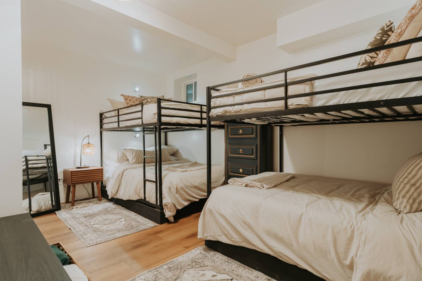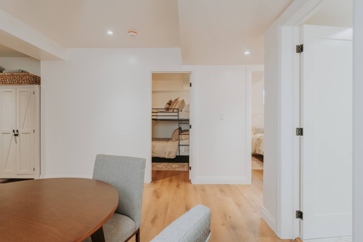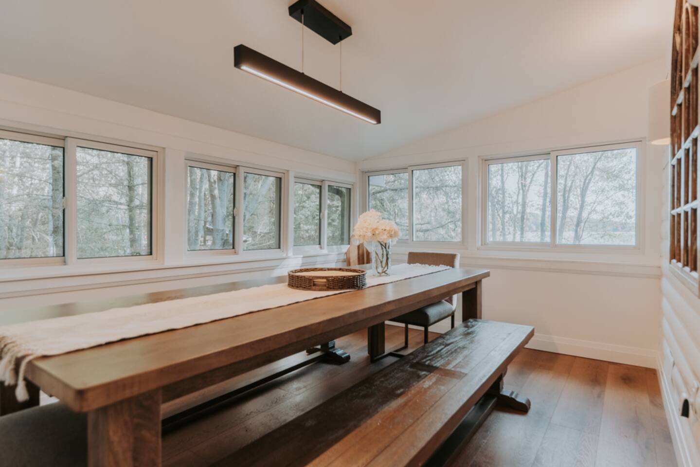 Key Features & Amenities -------------------------------- - On quiet 3 Mile Lake w/ West-facing sunset views - Hot tub - Private sandy beach - *NEW* Dock (not in photos) - Air conditioning - 2 Kayaks, 2 SUPs w/ life jackets (for adults and -children) - Lakeside Fire Pit - Hammocks overlooking lake - *NEW* Electric Vehicle Charger - Netflix - Back-up generator (Muskoka gets power outages - but you won’t!) - 180 Mbps Starlink internet (great for streaming & working) - Board games (Settlers of Catan, Code Names, Cranium & more!) - Fireplace & cozy couches - Dedicated office w/ desk & *NEW* extra monitor + HDMI/USB-C cable - Chef’s kitchen - BBQ - Big deck facing the lake - *NEW* Bassinet/Crib - Centrally located in Muskoka; 20 min drive from Port Carling, Huntsville and Bracebridge Lakeside Deck ------------------ - Hot tub (seats 6) - Lounge furniture (seats 10-12) - Fire table (NA during winter) - Sun/lounge chairs (2) Lakeside Backyard ----------------------- - *NEW* 80' dock - Hammock area (3 hammocks in the tree shade) - 2 Kayaks, 2 SUPs w/ life jackets for adults and children - Firepit with seating for 8 (firewood not provided, can be picked up on the way) - Hatchet, roasting sticks & water bucket Kitchen/Living room ------------------------- - Open concept, connects w/ Living Room - All brand-new appliances - Lake view from the sink - Big kitchen island w/ bar seating for 4 people - Dishwasher - Full-sized fridge & freezer (extra drinks fridge downstairs) - Ninja Blender - Keurig coffee maker w/ coffee pods provided - Drip coffee maker - Kettle & tea provided - Toaster - Microwave - Fully stocked with cookware and dishware - Cooking necessities provided (oil, salt & pepper) - 1 roll of paper towel provided Living Room (Main floor) ------------------------------ - Open concept & connects with Kitchen - Lake views - Modern gas fireplace - Big comfy couch sectional, lounge chair & ottomans (seating for 10-12) Dining Room/Muskoka Room ------------------------------------ - Lake views - Windows w/ screens surrounding - Table for 10-12 TV & Games Room (Downstairs) ---------------------------------------- - Big comfy sink-in couch sectional (seats 8-10) - Big-screen Smart TV w/ access to Netfilx and other streaming platforms - Home theater vibes - Board games & cards table for 4 (Settlers of Catan + extension, Code Names, Rummikub, Cranium, Bananagrams, Harry Potter Chess, Playing cards & more!) - Conveniently located beside the beverage fridge Master Bedroom (Main Floor) ------------------------------------ - Lake view from bed - King size bed - Premium mattress & bedding - Premium shower towel & beach towel (1 each per guest) Bedroom 2 (Main Floor) ----------------------------- - Queen size bed - Premium mattress & bedding - Premium shower towel & beach towel (1 each per guest) Bedroom 3 (Main Floor) ----------------------------- - Queen size bed - Premium mattress & bedding - Full-sized work desk w/ desk chair & lamp - Premium shower towel & beach towel (1 each per guest) Office/Nursery/Bedroom 4 (Main Floor) ------------------------------------------------- - Full-sized work desk w/ desk chair & lamp - *NEW* extra monitor + HDMI/USB-C cable - Couch/day-bed (Twin size bed) - Baby gate for stairs - *NEW* Bassinet/Crib Bedroom 5/Bunk-Bed Room (Downstairs) --------------------------------------------------- - Two queen over queen bunk beds (4 - beds/mattresses total) - Built-in funky reading lights - Premium shower towel & beach towel (1 per guest) Bedroom 6 (Downstairs) ------------------------------ - Queen size bed - Premium mattress & bedding - Premium shower towel & beach towel (1 per guest) 3-PC Bathroom (Main Floor) ---------------------------------- - Walk-in tile shower - Fully stocked w/ body soap, shampoo and conditioner - Make-up towels and hair dryer - 3 rolls of toilet paper provided 2-PC Bathroom (Main Floor) ---------------------------------- - Premium hand-towels - Fully stocked w/ soap - 3 rolls of toilet paper provided 3-PC Bathroom (Downstairs) ----------------------------------- - Spacious - Walk-in tile shower - Double vanity (mirrors not as shown due to temporary replacement) - Fully stocked w/ body soap, shampoo and conditioner - Make-up towels and hair dryer - 3 rolls of toilet paper provided Laundry Room ------------------ - High Volume Washer & Dryer - Laundry detergent sheets, dryer balls & dryer sheets - Iron & Ironing board Front Deck & Driveway ---------------------------- - *NEW* EV Charger - Parking for up to 6 vehicles - BBQ & seating area